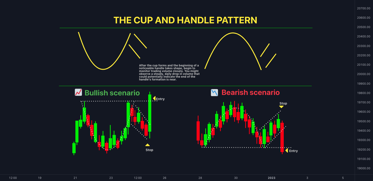 The cup and handle pattern is a bullish continuation pattern that, as its name suggests, resembles a cup with a handle. The “cup” is formed by a gradual decline in price followed by a rounded bottom and a subsequent rally back to the initial high. This phase signifies a period of consolidation where selling pressure is absorbed. The “handle” then develops as a short, downward-sloping consolidation period, typically with lower trading volume, before the price breaks out above the resistance formed by the cup’s high.